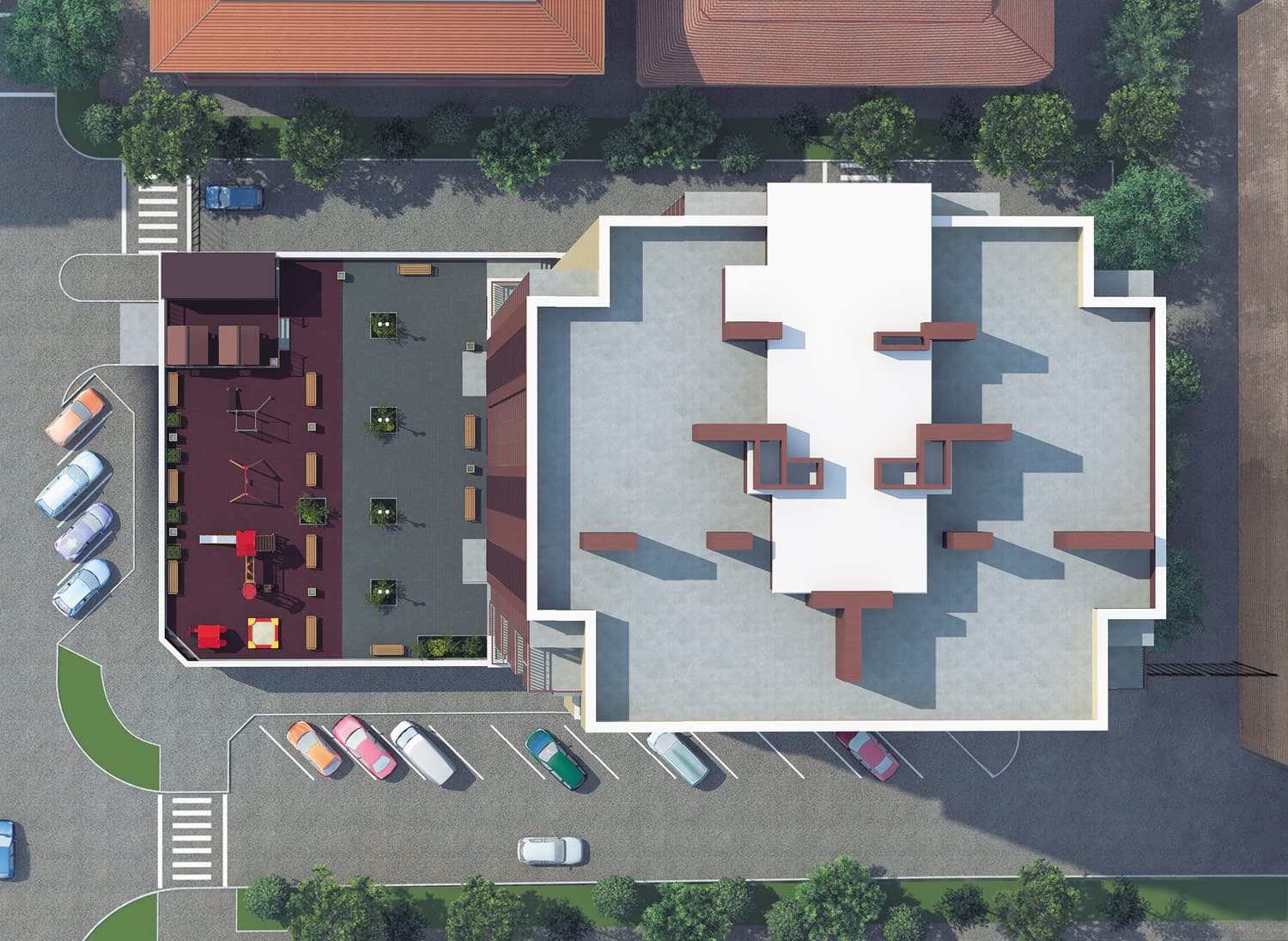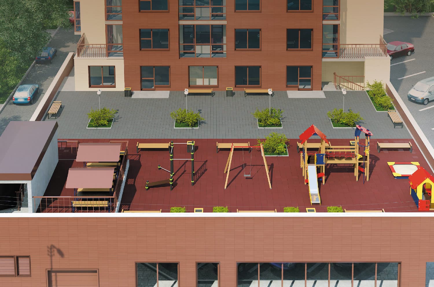 В стилобатной части (на первом этаже) разместится продуктовый супермаркет. Прямо над ним, на эксплуатируемой кровле — благоустроенная детская площадка и места для отдыха. Доступ во двор и на детскую площадку — только для жильцов.